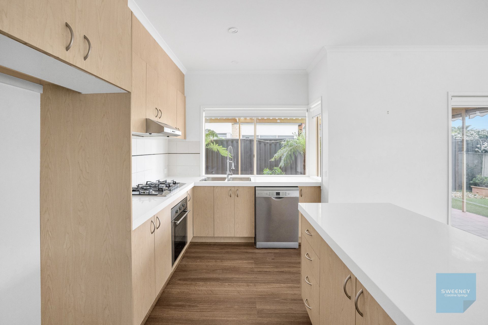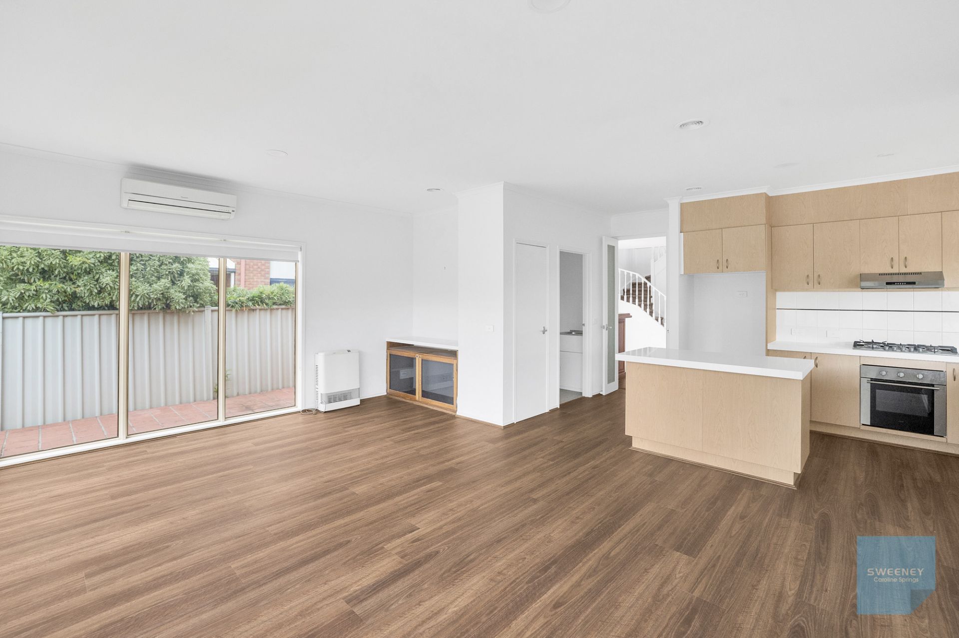 - The spacious open-plan family and dining area bathed in natural light with features of Caesarstone benchtops, stainless steel gas cooktop, dishwasher and ample storage space with a split system