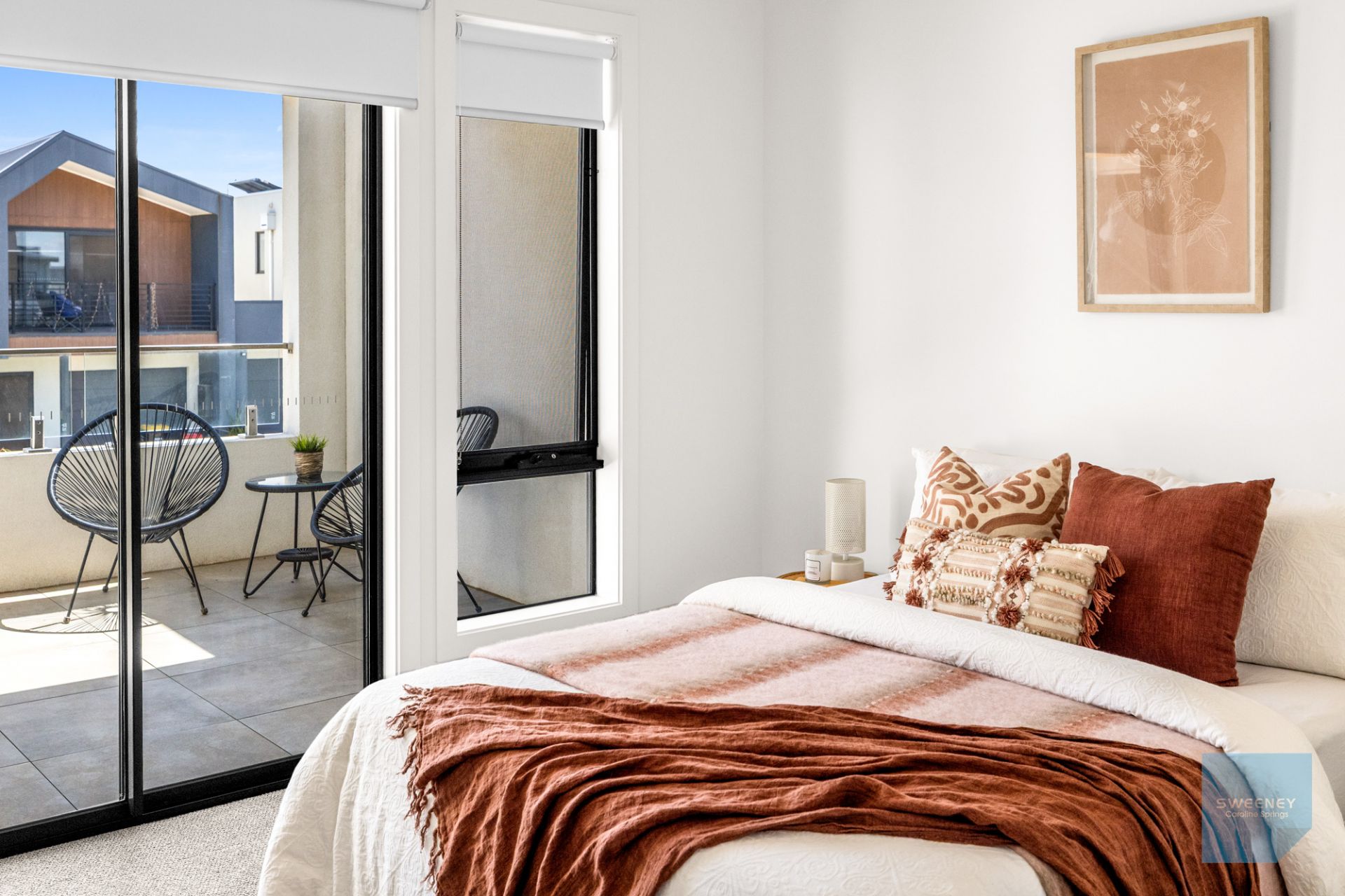 Across two light-filled levels, the home showcases a beautifully balanced layout. The upper floor features open-plan living and dining zones complemented by a sleek hostess kitchen with stainless steel appliances, stone bench tops, dishwasher and excellent cupboard and bench space. Glass sliding doors extend to a generous private balcony, perfect for a morning coffee or relaxed entertaining.